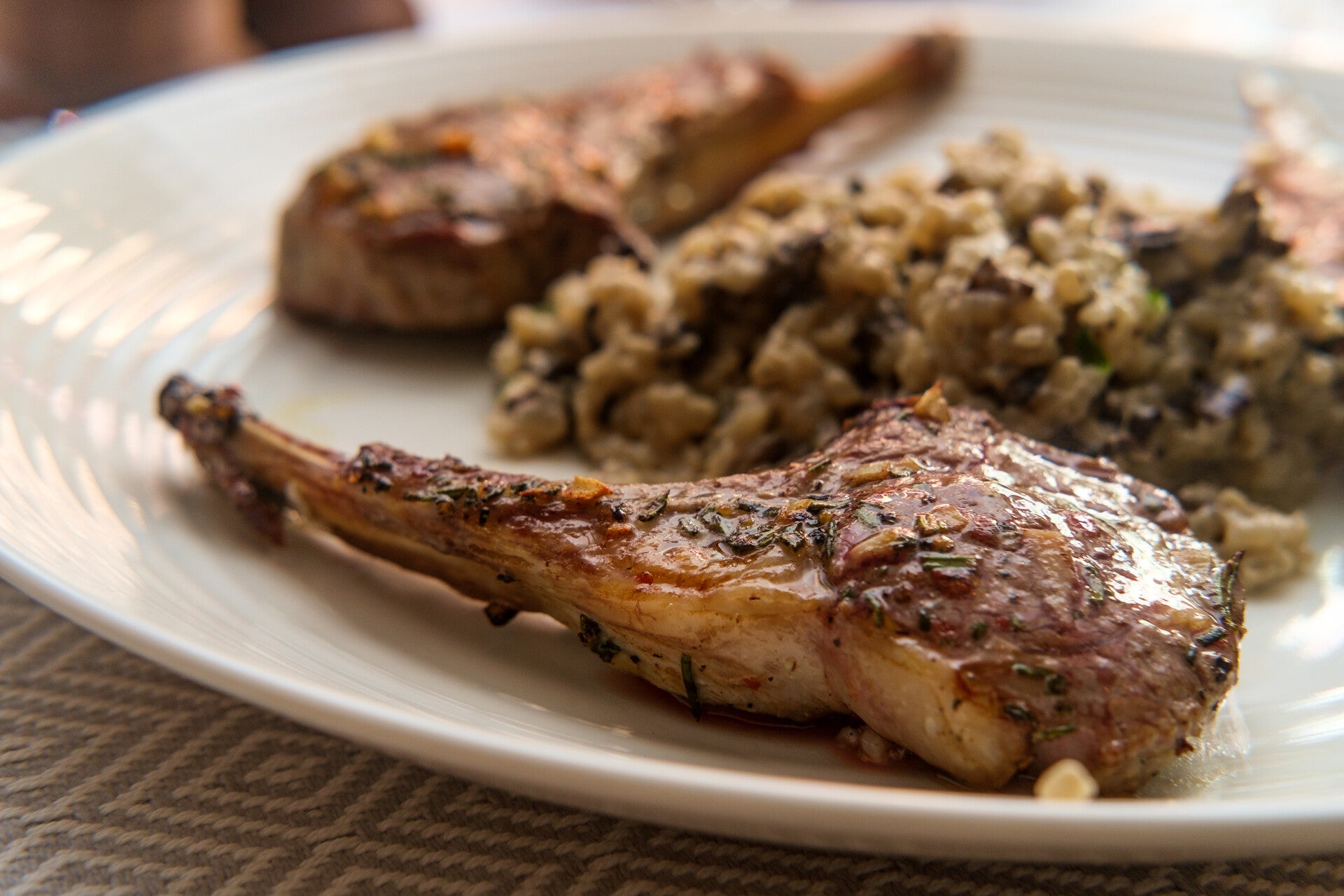 Zacht gestoofde kalfswang met championrisotto, groene asperges en vlokken Parmezaanse kaas.