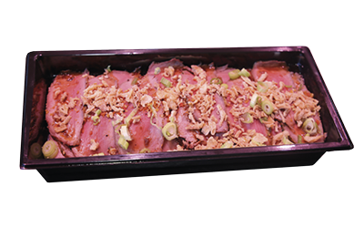 Dun gesneden biefstuk, marinade, gebakken uitjes & bosui.